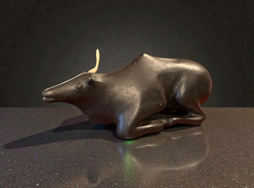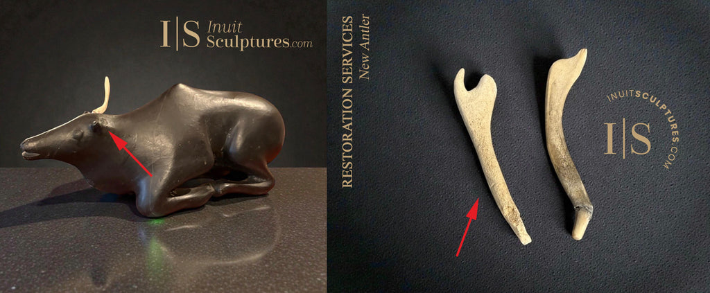 This beautiful and historically important Eskimo Caribou by Pioneering artist Jacob Irkok had one of its antlers misplaced. Our restorer, Jean, carefully made another.