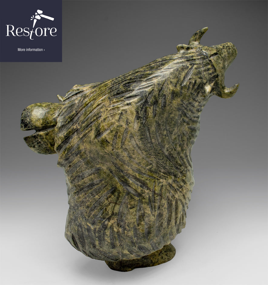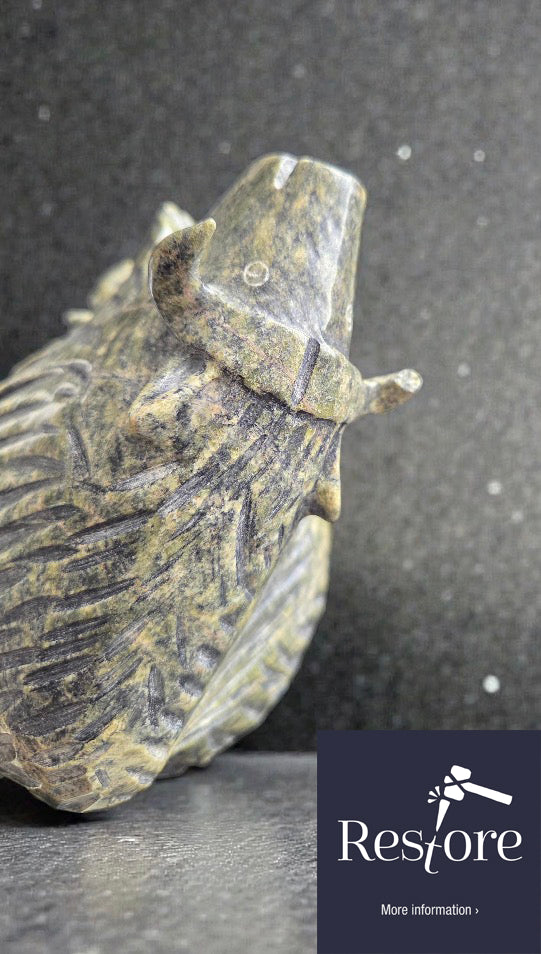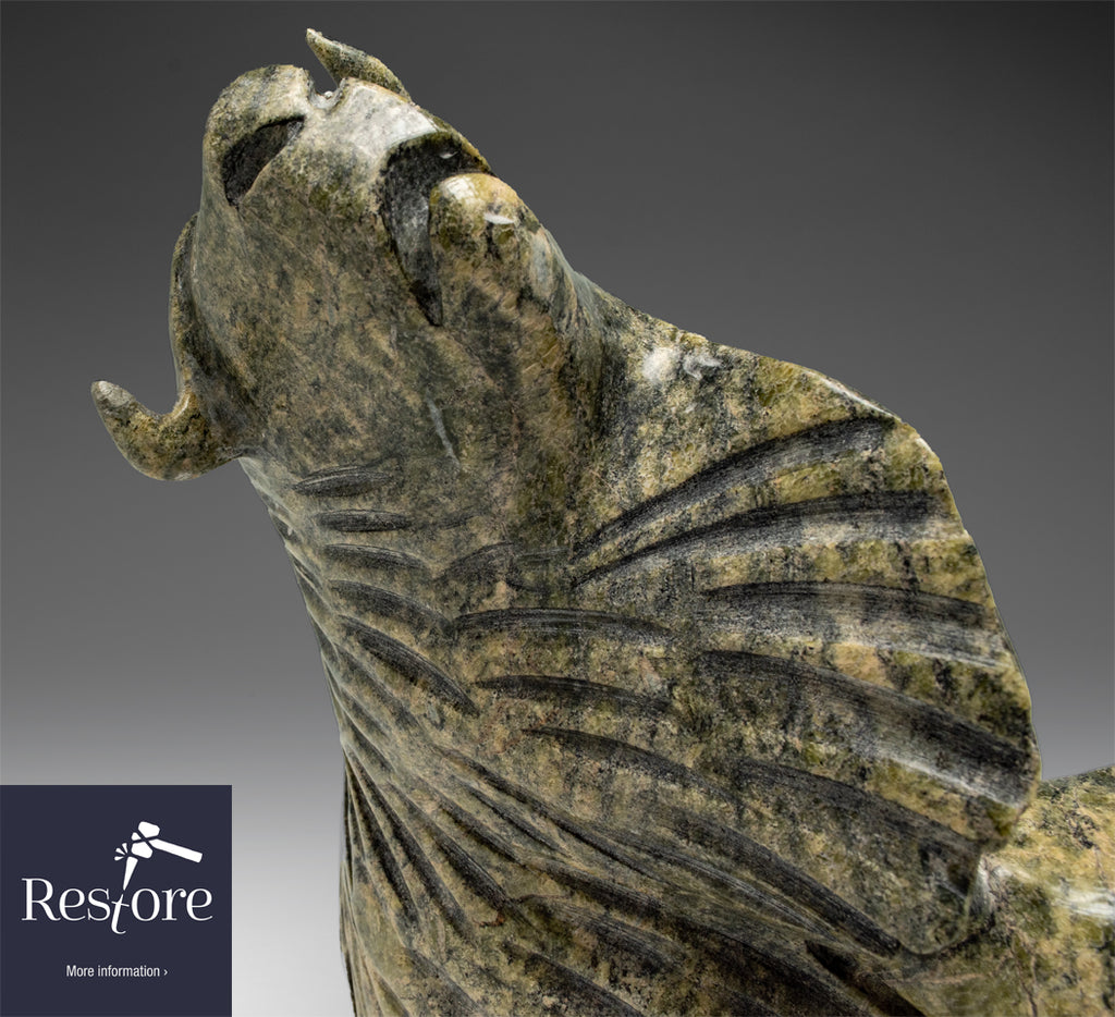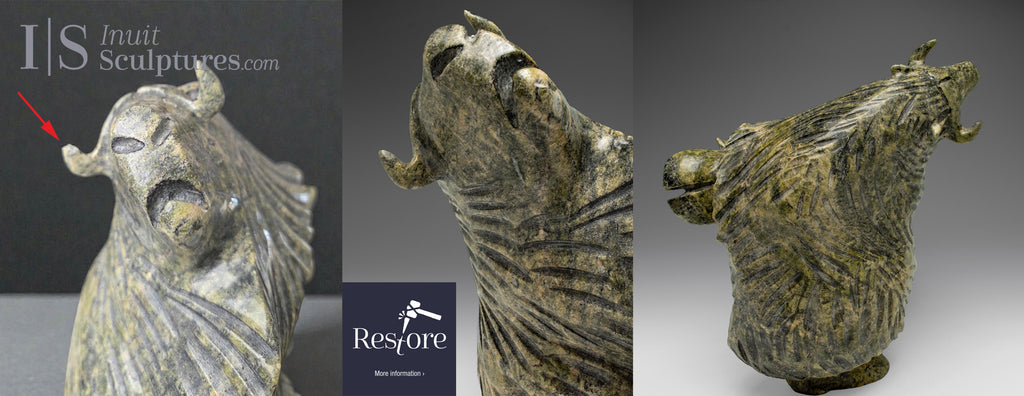 Here is an amazing dancing Walrus by Kellypalik Qimirpik. His jubilee muskox is so in demand by our clients. Our client sent us this piece from Washington state with its ear broken off and missing.